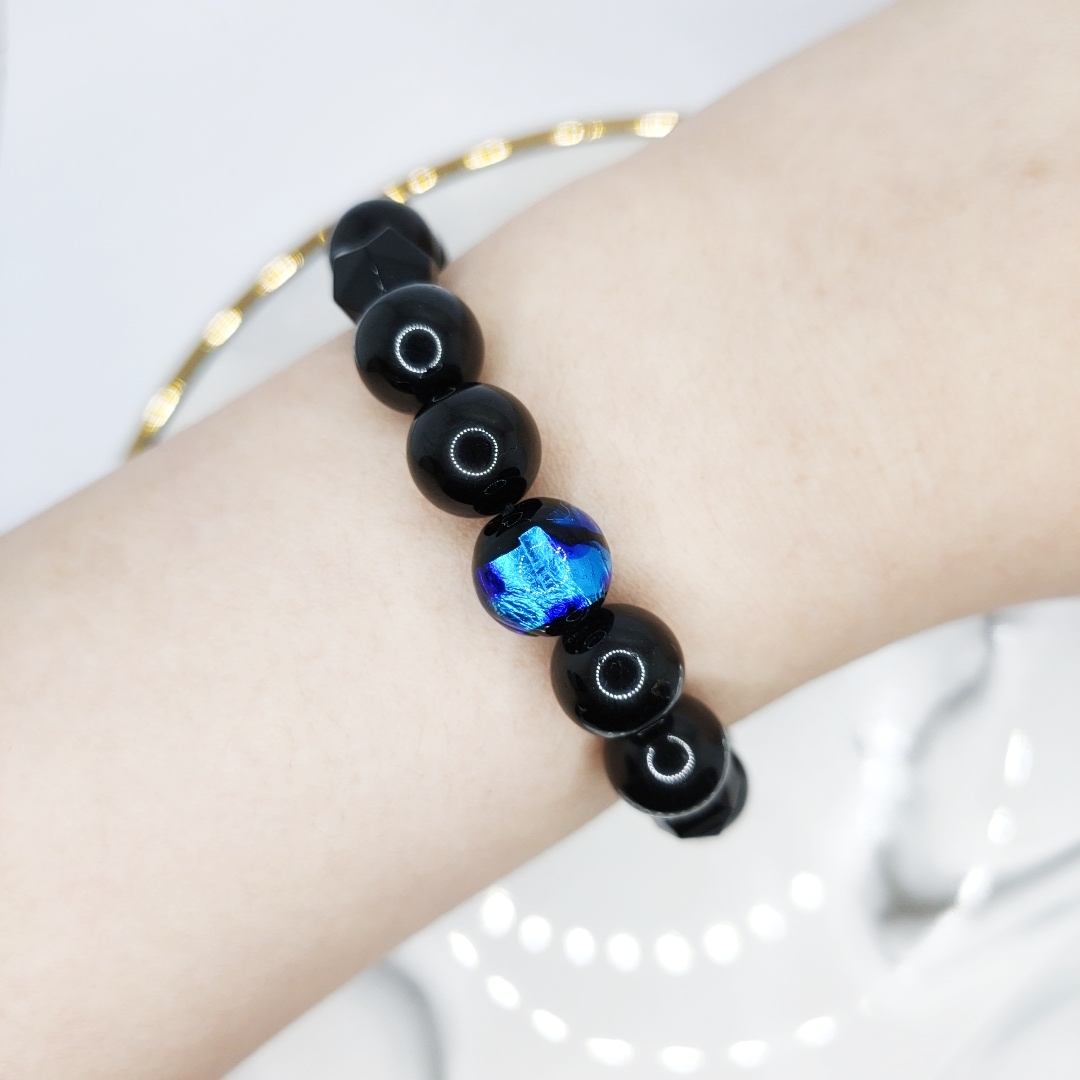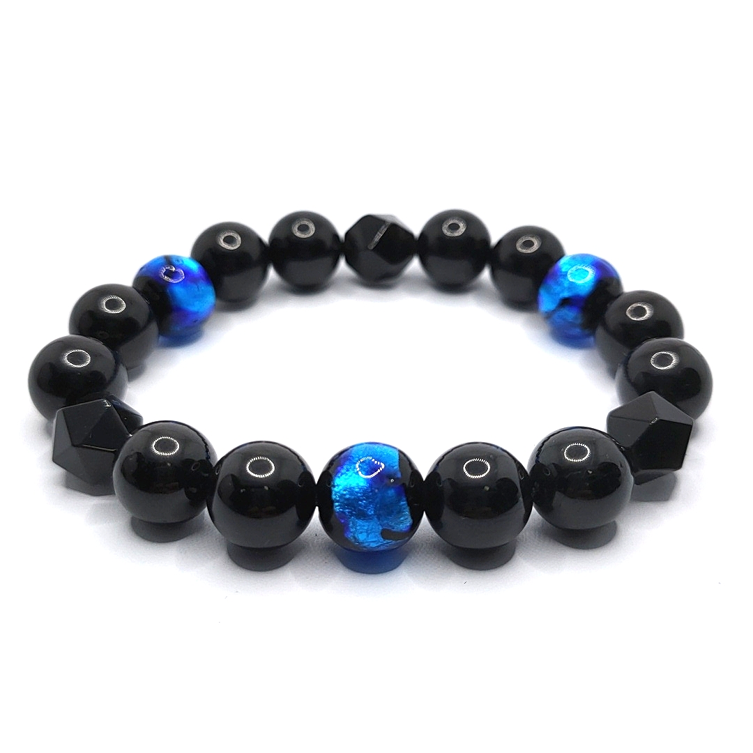 Featuring Black Tourmaline (8mm beads), Faceted Obsidian (10mm beads), Custom-made Blue Glass bead (10mm)