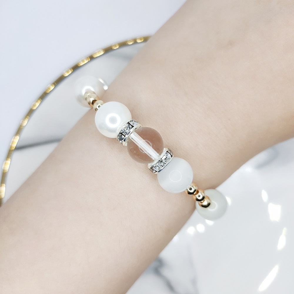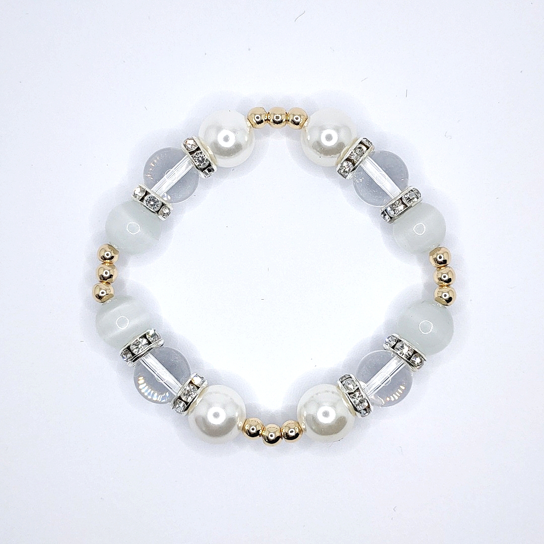 This bracelet is designed with various white gems such as clam pearls, white cat’s eye and clear quartz. White gems are a popular gift for brides. Pearls symbolizes innocence and is often associated with love and weddings. It speaks of the wearer’s integrity and loyalty. Often offered as a token of affection, pearls are also believed to attract good luck and wealth.